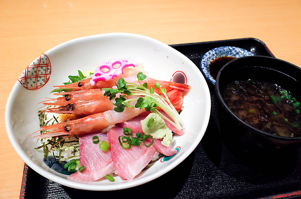 夜、食事をしようと出掛けたところ、この時期はまだまん延防止の影響でか営業しているお店も少なく、この前の別府同様、ちょっとばかり食事難民になりかけてしまった。暫くうろうろ歩くと折りよく営業しているお店を見つける事ができた。 - 海鮮丼のお店だ。福井では連日の肉食だった事もあり、丁度良かったかも。