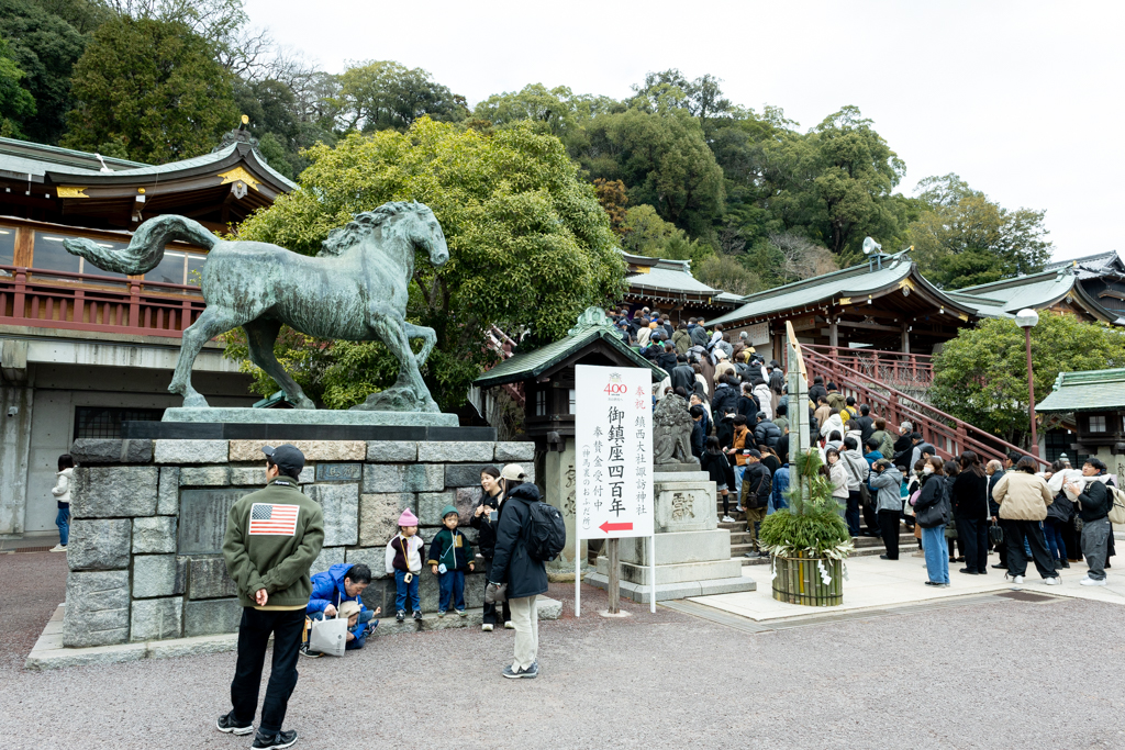 本殿へと続く階段横には、平和祈念像を制作した北村西望さんが制作した神馬像もあり、午年の今年にはぴったりの像だ。この像、何と北村さんが102歳の時に制作したものらしい。
