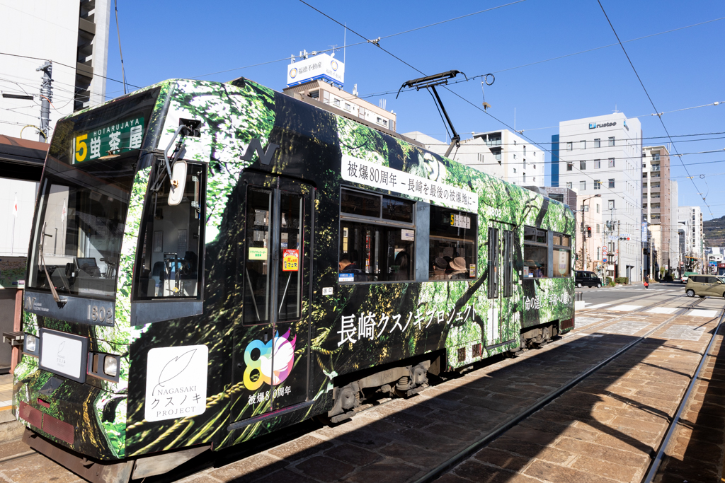 今回も昨年の夏に引き続き、ラッピング路面電車の「クスノキ号」が走っていました。昨年被爆から80年、被爆にも耐えたクスノキ(昨年の紅白で福山雅治さんもこのクスノキをテーマにした曲を披露していましたね)の写真を全面にラッピングした電車だ。