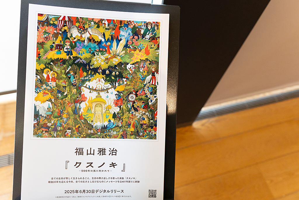 特別展示室では「クスノキ/福山雅治×junaida」の作品も鑑賞。長崎には爆心地近くに80年前に被爆したクスノキ(山王神社の大クス)があり、以前このクスノキをテーマに福山さんが曲にしたのだが、今回はその曲に合わせたアニメーションをjunaidaさんが制作し、原画と共に展示されていました。